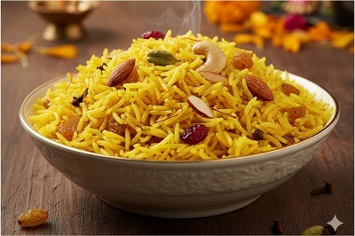अंत में ऊपर से भुने हुए काजू, किशमिश और पिस्ता डालकर गार्निश करें। स्वाद और सुगंध से भरपूर यह बसंती पुलाव बसंत पंचमी के दिन भोग और प्रसाद दोनों के लिए उत्तम है।