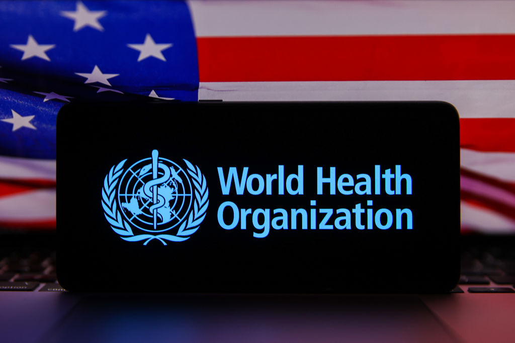 World Heatlh Organization (WHO) logo is displayed on a mobile phone screen with US flag in the background for illustration photo. Krakow, Poland on February 6th, 2025 (Photo by Beata Zawrzel/NurPhoto via Getty Images)