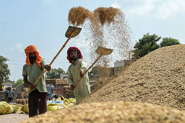 Labourers use shovels to separate grains of paddy rice from the husk at a wholesale grain market on the outskirts of Amritsar on September 18, 2025. (Photo by Narinder NANU / AFP) (Photo by NARINDER NANU/AFP via Getty Images)