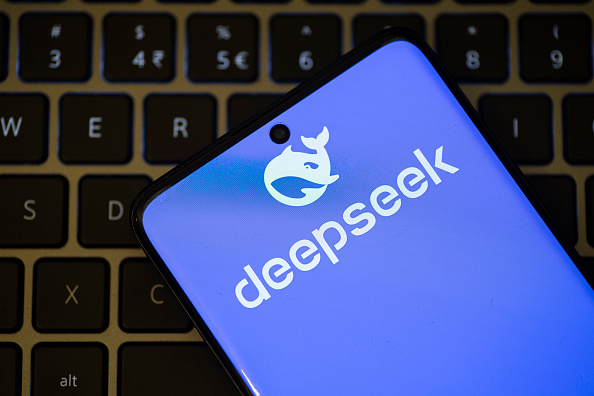 DeepSeek AI app logo photo illustration, of the Chinese artificial intelligence company that develops open-source large language models LLM in a fraction of the cost of the US based competition. DeepSeek logo displayed on a smartphone screen on an illuminated laptop keyboard. Amsterdam, the Netherlands on January 28, 2025 (Photo by Nicolas Economou/NurPhoto via Getty Images)