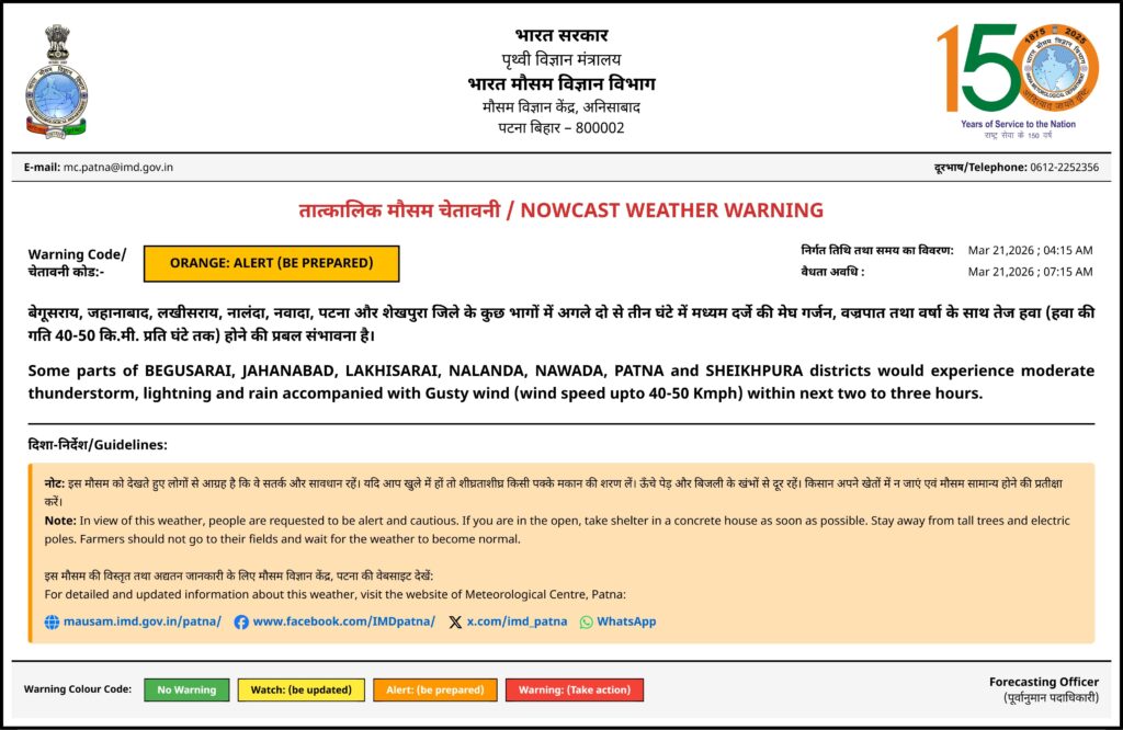 मौसम विभाग ने स्थिति को गंभीर मानते हुए गोपालगंज, सारण ,सीवान, वैशाली, बेगूसराय, जहानाबाद, लखीसराय, नालंदा, नवादा,पटना और शेखपुरा जिले के कुछ भागों में अगले दो से तीन घंटों में मध्यम दर्जे की मेघ गर्जना , वज्रपात तथा वर्षा के साथ 40 से 50 किलोमीटर प्रति घंटे की रफ्तार से हवा चलने को लेकर अलर्ट जारी किया है।